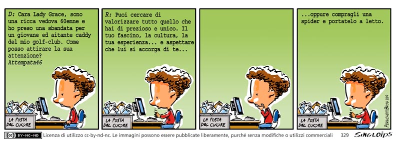D: Cara Lady Grace, sono una ricca vedova 60enne e ho preso una sbandata per un giovane ed aitante caddy del mio golf-club. Come posso attirare la sua attenzione? Attempata46 – R: Puoi cercare di valorizzare tutto quello che hai di prezioso e unico. Il tuo fascino, la cultura, la tua esperienza… e aspettare che lui si accorga di te… – R …oppure compragli una spider e portatelo a letto.
