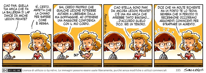 Meg: Ciao Pam. Quella tua amica che fa la ballerina di lap dance dà anche lezioni private? – Pam: Si, certo. Aspetta che la chiamo per sapere come è messa. – Gea: Sai, credo proprio che qualche lezione potrebbe aiutarmi a liberarmi dalla mia goffaggine. Ad ottenere una maggiore confidenza con il mio corpo. – Pam: Ciao stella, sono Pam! Dai ancora lezioni private? C’è una mia amica che avrebbe tanto bisogno… – Pam: D’accordo glielo dico. Sei un tesoro. – Pam: Dice che ha molte richieste ma un posto te lo trova. Sembra che in periodo di recessione occorrano argomenti convincenti per strappare un aumento.