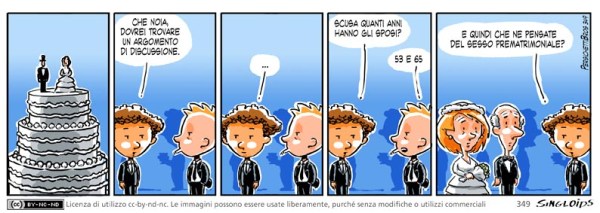 Bob: Che noia, dovrei trovare un argomento di discussione – Bob: Scusa quanti anni hanno gli sposi? – Ted: 53 e 65. – Bob: E quindi che ne pensate del sesso prematrimoniale?