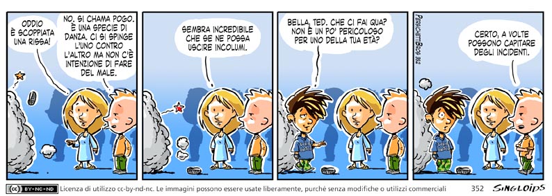 Gea: Oddio è scoppiata una rissa! – Ted: No. Si chama pogo. E’ una specie di danza. Ci si spinge l’uno contro l’altro ma non c’è intenzione di fare del male. – Gea: Sembra incredibile che se ne possa uscire incolumi. – Emo: Bella, Ted. Che ci fai qua? Non è un po’ pericoloso per uno della tua eta? – Ted: Certo, a volte possono capitare degli incidenti