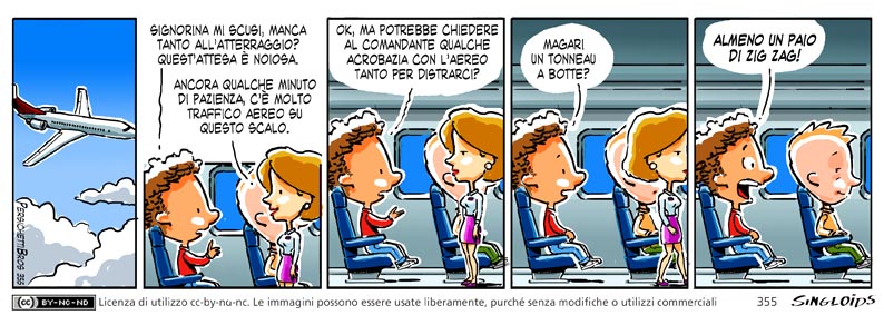 Bob: Signorina mi scusi, manca tanto all’atterraggio? quest’attesa è noiosa. – Hostess: Ancora qualche minuto di pazienza, c’è molto traffico aereo su questo scalo. – Bob: Ok, ma potrebbe chiedere al comandante qualche acrobazia con l’aereo tanto per distrarci? – Bob: Magari un tonneau a botte? – Bob: Almeno un paio di zig zag!