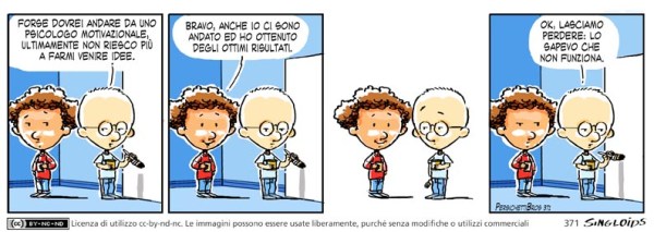 Sid: Forse dovrei andare da uno psicologo motivazionale, ultimamente non riesco più a farmi venire idee. – Bob: Bravo, anche io ci sono andato ed ho ottenuto degli ottimi risultati. – Sid: Ok, lasciamo perdere: lo sapevo che non funziona.