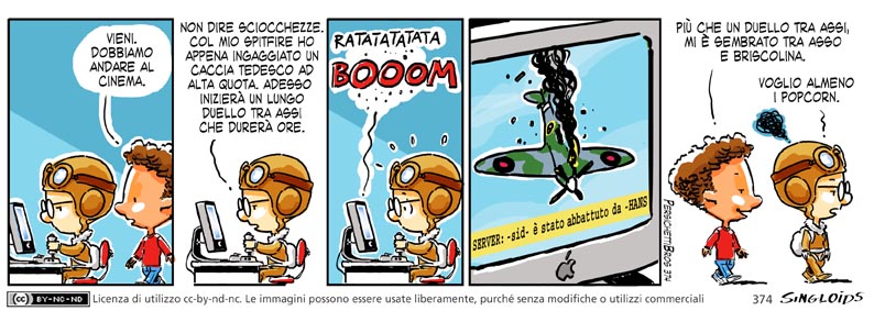 Bob: Vieni. Dobbiamo andare al cinema. – Sid: Non dire sciocchezze. Col mio spitfire ho appena ingaggiato un caccia tedesco ad alta quota. Adesso inizierà un lungo duello tra assi che durerà ore. – PC: ratatatatata BOOOOM – SERVER: -sid- è stato abbattuto da -HANS- – Bob: Più che un duello tra assi, mi è sembrato tra asso e briscolina. Sid: Voglio almeno i popcorn.