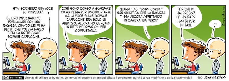 Sid: Stai scrivendo una voce su wikipedia? – Bob: Sì, ero impegnato nei preliminari con una ragazza, quando lei mi ha detto che voleva farlo tutta la notte come scimmie cappuccine. – Bob: Così sono corso a guardare su Wikipedia per documentarmi, ma la voce sulle scimmie cappuccine era solo un abbozzo. Allora ho cercato in rete informazioni per completarla. – Sid: Quando dici “sono corso” non significa che la ragazza ti sta ancora aspettando in camera tua, vero? – Bob: Per chi mi hai preso. Le ho dato i soldi per un taxi. – Sid: …
