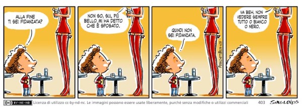 Bob: Alla fine ti sei fidanzata? – Sally: Non so, sul più bello mi ha detto che è sposato. – Bob: Quindi non sei fidanzata. – Sally: Va beh, non vedere sempre tutto o bianco o nero.