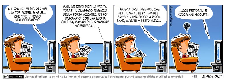 Presentatore: Allora Liz. Mi dicono sei una top model single… che tipo di uomo stai cercando? – Liz: Mah, se devo dirti la verità, vorrei il classico ragazzo della porta accanto. Un po’ imbranato, con una buona cultura, magari di formazione scientifica… …sognatore, ingenuo, che nel tempo libero suoni il basso in una piccola rock band, magari a petto nudo… …con pettorali e addominali scolpiti.