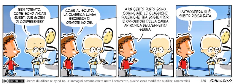 Sid: Ben tornato. Come sono andati questi due giorni di conferenze. – Bob: Come al solito. La classica lunga sequenza di oratori noiosi. A un certo punto sono cominciate le classiche polemiche tra sostenitori e oppositori della causa antropica dell’effetto serra. – Bob: L’atmosfera si è subito riscaldata.