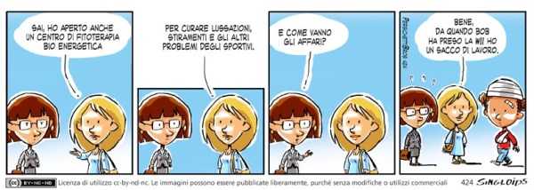 Gea: …ho aperto anche un centro di fitoterapia bio energetica per curare lussazioni, stiramenti e gli altri problemi degli sportivi. – Meg: E come vanno gli affari? – Gea: Bene, da quando Bob ha preso la Wii ho un sacco di lavoro.