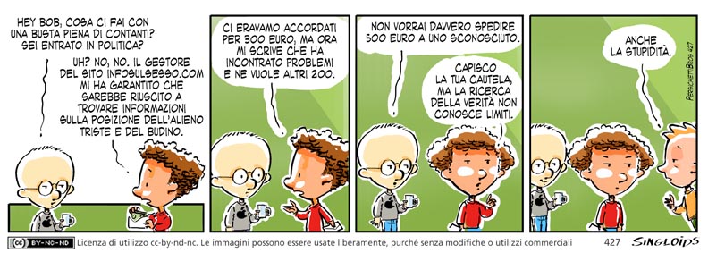 Sid: Hey Bob, cosa ci fai con una busta piena di contanti? Sei entrato in politica? – Bob: Uh? No, no. Il gestore del sito infosulsesso.com mi ha garantito che sarebbe riuscito a trovare informazioni sulla posizione dell’alieno triste e del budino. – Bob: Ci eravamo accordati per 300 euro, ma ora mi scrive che ha incontrato problemi e ne vuole altri 200. – Sid: Non vorrai davvero spedire 500 euro a uno sconosciuto. – Bob: Capisco la tua cautela, ma la ricerca della verità non conosce limiti. – Ted: Anche la stupidità.
