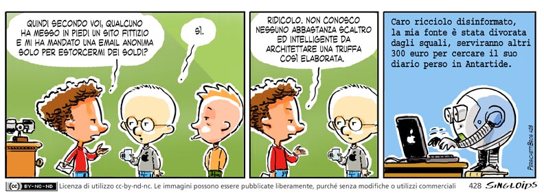 Bob: Quindi secondo voi, qualcuno ha messo in piedi un sito fittizio e mi ha mandato una email anonima solo per estorcermi dei soldi? – Sid: Sì – Bob: Ridicolo. Non conosco nessuno abbastanza scaltro ed intelligente da architettare una truffa così elaborata. – icoso: Caro Ricciolo disinformato, la mia fonte è stata divorata dagli squali, serviranno altri 300 euro per cercare il suo diario perso in Antartide.