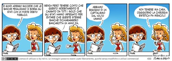 Meg: E quindi adesso succede che le banche penalizzano in borsa gli stati con un forte debito pubblico. – Meg: Senza però tenere conto che questo indebitamento è causato da tutti i soldi che gli stati hanno impiegato per evitare che queste stesse banche dichiarassero bancarotta un anno fa. – Meg: Abbiamo bisogno di un capitalismo dal volto umano! – Pam: Non tenere mia cara, oggigiorno la chirurgia estetica fa miracoli!