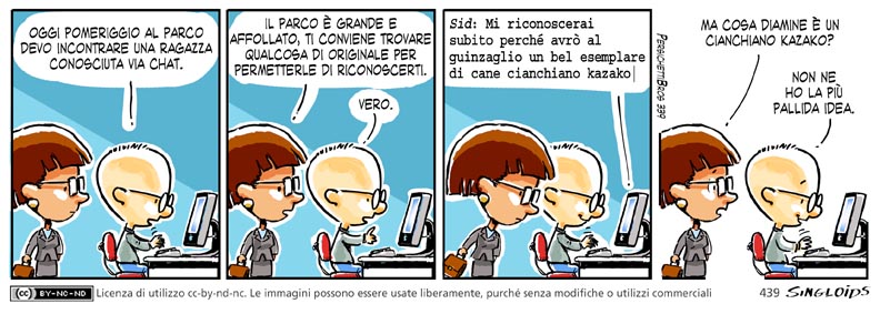 Sid: Oggi pomeriggio al parco devo incontrare una ragazza conosciuta via chat. – Meg: Il parco è grande e affollato, ti conviene trovare qualcosa di originale per permetterle di riconoscerti. – Sid: Vero. – Sid: Mi riconoscerai subito perchè avrò al guinzaglio un bel esemplare di cane cianchiano kazako. – Meg: Ma cosa diamine è un cianchiano kazako? – Sid: Non ne ho la più pallida idea.
