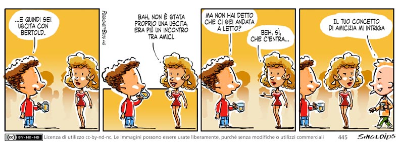 Bob: …e quindi sei uscita con Bertold. – Pam: Bah, non è stata proprio una uscita, era più incontro tra amici. – Bob: Ma non hai detto che ci sei andata a letto? – Pam: Beh, sì, che c’entra… – Ted: Il tuo concetto di amicizia mi intriga.
