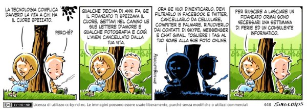 Gea: La tecnologia complica davvero la vita a chi ha il cuore spezzato. – Ted: Perché? – Gea: Qualche decina di anni fa, se il fidanzato ti lasciava spezzandoti il cuore, gettavi nel camino le sue lettere d’amore e qualche fotografia e così l’avevi cancellato dalla tua vita. – Gea: Ora se vuoi dimenticarlo, devi filtrarlo in facebook e twitter, cancellarlo da cellulare, computer e palmare. Rimuoverlo dai contatti di skype, messenger e chat gmail. Togliere i tag al tuo nome alla sue foto online. – Gea: Per riuscire a lasciare un fidanzato ormai sono necessari una settimana di ferie ed un consulente informatico.