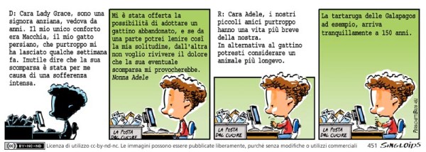 D: Cara Lady Grace, sono una signora anziana, vedova da anni. Il mio unico conforto era Macchia, il mio gatto persiano, che purtroppo mi ha lasciato qualche settimana fa. Inutile dire che la sua scomparsa è stata per me causa di una sofferenza intensa. – D: Mi è stata offerta la possibilità di adottare un gattino abbandonato, e se da una parte potrei lenire così la mia solitudine, dall’altra non voglio rivivere il dolore che la sua eventuale scomparsa mi provocherebbe. Nonna Adele. – R: Cara Adele, i nostri piccoli amici purtroppo hanno una vita più breve della nostra. In alternativa al gattino potresti considerare un animale più longevo. – R: La tartaruga delle Galapagos ad esempio, arriva tranquillamente a 150 anni.
