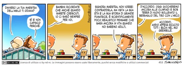 Sid: Davvero la tua maestra dell’asilo ti odiava? – Bob: Sì e non capisco perché. – Maestra: Bambini ricordate che anche quando sarete cresciuti, io ci sarò sempre per voi. – Bob: Signora maestra, non vorrei contraddirla, ma vista la sua età e la sua storia di grande fumatrice, è scientificamente poco realistico pensare che sarà ancora in vita quando noi saremo adulti. – Maestra: D’accordo. Oggi giocheremo ancora alle olimpiadi e Bob terrà di nuovo sollevato il bersaglio del tiro con l’arco. – Bob: Accidenti. Avevo appena ricucito tutti i buchi nel mio grembiule.