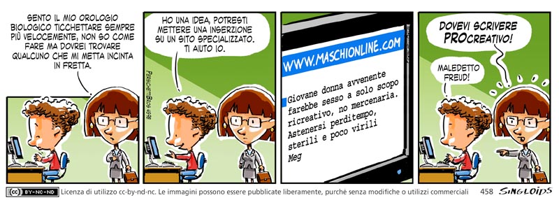 Meg: Sento il mio orologio biologico ticchettare sempre più velocemente, non so come fare ma dovrei trovare qualcuno che mi metta incinta in fretta. – Bob: Ho una idea, potresti mettere una inserzione su un sito specializzato. Ti aiuto io. – Schermo: http://www.maschionline.com “Giovane donna avvenente farebbe sesso a solo scopo ricreativo, no mercenaria. Astenersi perditempo, sterili e poco virili” – Meg: Dovevi scrivere procreativo! – Bob: Maledetto Freud!