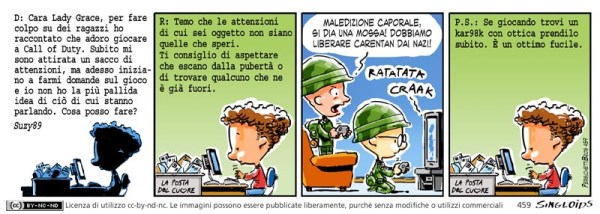 Subito mi sono attirata un sacco di attenzioni, ma adesso iniziano a farmi domande sul gioco e io non ho la più pallida idea di ciò di cui stanno parlando. Cosa posso fare? – R: Temo che le attenzioni di cui sei oggetto non siano quelle che speri. Ti consiglio di aspettare che escano dalla pubertà o di trovare qualcuno che ne è già fuori. – Sid e Ted: Maledizione caporale, si dia una mossa! Dobbiamo liberare Carentan dai Nazi! – Bob: P.S.: Se giocando trovi un kar98k con ottica prendilo subito. E’ un ottimo fucile.