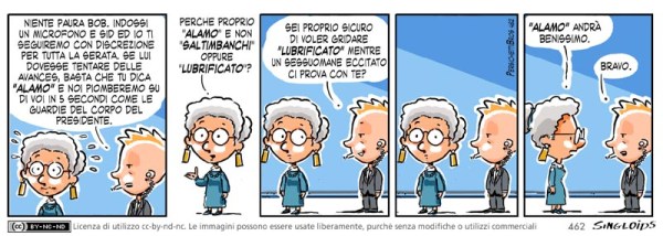 Ted: Niente paura Bob. Indossi un microfono e Sid ed io ti seguiremo con discrezione per tutta la serata. Se lui dovesse tentare delle avances, basta che tu dica “alamo” e noi piomberemo su di voi in 5 secondi come se fossimo le guardie del corpo del presidente. – Bob: Perché proprio “alamo” e non “saltimbanchi” oppure “lubrificato”? – Ted: Sei proprio sicuro di voler gridare “lubrificato” mentre un sessuomane eccitato ci prova con te? – Bob: “alamo” andrà benissimo. – Ted: Bravo.