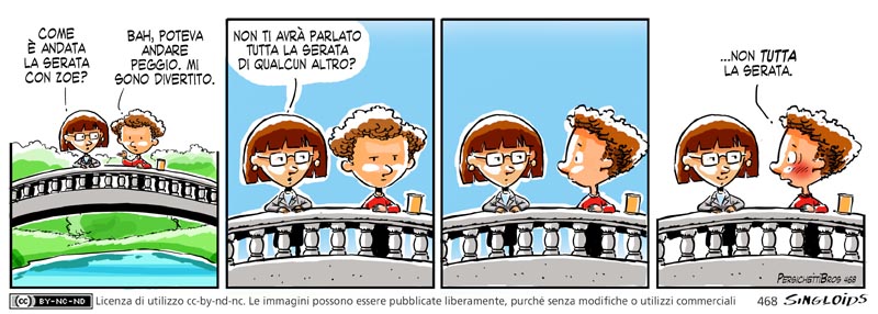 Gea: Come è andata la serata con Zoe? – Bob: Bah, poteva andare peggio. Mi sono divertito. – Gea: Non ti avrà parlato tutta la serata di qualcun altro? – Bob: …non TUTTA la serata.