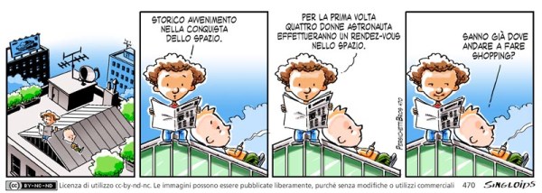 Bob: Storico avvenimento nella conquista dello spazio. – Bob: Per la prima volta quattro donne astronauta effettueranno un rendez-vous nello spazio. – Ted: Sanno già dove andare a fare shopping?
