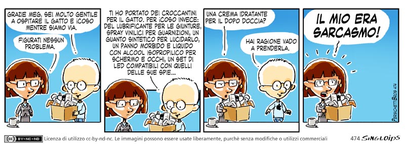 Sid: Grazie Meg, sei molto gentile a ospitare il gatto e icoso mentre siamo via. – Meg: Figurati nessun problema. – Sid: Ti ho portato dei croccantini per il gatto. per icoso invece: del lubrificante per le giunture, spray vinilici per guarnizioni, un guanto sintetico per lucidarlo, un panno morbido e liquido con alcool isopropilico per schermo e occhi, un set di led compatibili con quelli delle sue spie.. -Meg: Una crema idratante per il dopo doccia? – Sid: Hai ragione, vado a prenderla. – Meg: Il mio era sarcasmo!