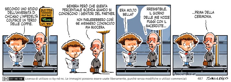 Bob: Secondo uno studio dell’università di Chicago l’infedeltà colpisce un terzo delle coppie. – Bob: Sembra però che questa percentuale scenda quando si conoscono i genitori del partner. – Uomo alla fermata: Non parlerebbero così se avessero conosciuto mia suocera. – Bob: Era molto bella? – Uomo alla fermata: Irresistibile. Il giorno delle mie nozze fuggi con il sacerdote… – Uomo alla fermata: …prima della cerimonia.