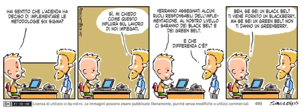 Ted: Hai sentito che l’azienda ha deciso di implementare le metodologie Six Sigma? – Collega: Si. Mi chiedo come questo influirà sul lavoro di noi impiegati. – Ted: Verranno assegnati alcuni ruoli responsabili dell’implementazione. Al nostro livello ci saranno dei black belt e dei green belt. – Collega: E che differenza c’è? – Ted: Beh, se sei un black belt ti viene fornito un blackberry, ma se sei un green belt non ti danno un greenberry.