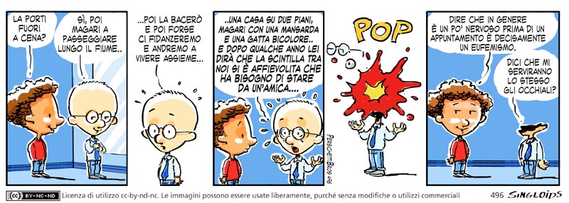 Bob: La porti fuori a cena? – Sid: Sì, poi magari a chiacchierare lungo il fiume.. – Sid: …poi la bacerò e poi forse ci fidanzeremo e andremo a vivere assieme… – Sid: ..una casa su due piani, magari con una mansarda e una gatta bicolore… e dopo qualche anno lei dirà che la scintilla tra noi si è affievolita che ha bisogno di stare da un’amica…. – Bob: Dire che in genere è un po’ nervoso prima di un appuntamento è decisamente un eufemismo. – Sid: Dici che mi serviranno lo stesso gli occhiali?