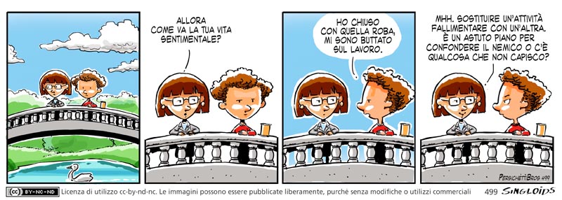 Meg: Allora come va la tua vita sentimentale? – Bob: Ho chiuso con quella roba, mi sono buttato sul lavoro. – Meg: Mhh. Sostituire un’attività fallimentare con un’altra. E’ un astuto piano per confondere il nemico o c’è qualcosa che non capisco?
