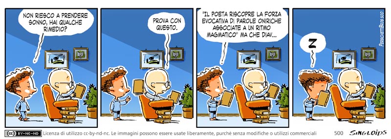 Bob: Non riesco a prendere sonno, hai qualche rimedio? – Sid: Prova con questo. – Bob: “Il poeta riscopre la forza evocativa di parole oniriche associate e un ritmo magmatico” Ma che diav…
