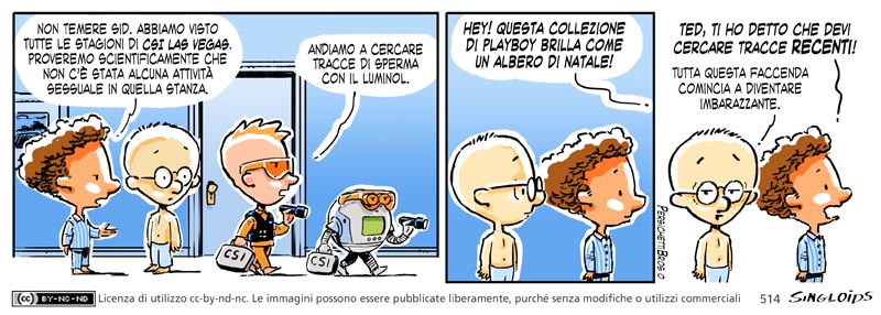 Bob: Non temere Sid. Abbiamo visto tutte le stagioni di CSI Las Vegas. Proveremo scientificamente che non c’è stata alcuna attività sessuale in quella stanza. – Ted: Hey! Questa collezione di playboy brilla come un albero di natale. – Bob: Ted, ti ho detto che devi cercare tracce RECENTI! – Sid: Tutta questa faccenda comincia ad diventare imbarazzante.