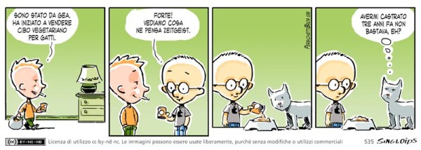 Ted: Sono stato da Gea. ha iniziato a vendere cibo vegetariano per gatti. – Sid: Forte! Vediamo cosa ne pensa Zeitgeist. – Zeitgeist: Avermi castrato tre anni fa non bastava, eh?