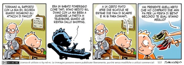 Psicologo: Torniamo al rapporto con la sua ex. Ricorda quando iniziarono gli attacchi di panico? – Ted: Era un sabato pomeriggio come tanti. Stavo seduto sul divano con la mia birra a guardare la partita in televisione, quando lei rientra dallo shopping. – Ted: A un certo punto apre due scatole ne estrae due paia di scarpe e mi si para davanti. – Ex: Hai presente quell’abito che ho comprato due anni fa per la festa di Beth? Secondo te quali stanno meglio?
