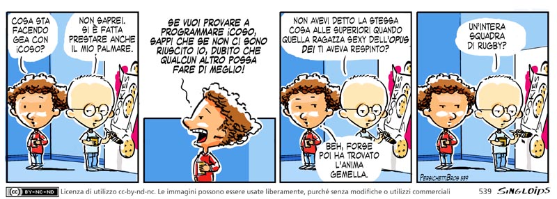 Bob: Cosa sta facendo Gea con iCoso? – Sid: Non saprei. Si è fatta prestare anche il mio palmare. – Bob: Se vuoi provare a programmare iCoso; sappi che se non ci sono riuscito io, dubito che qualcun’altro possa fare di meglio! – Sid: Non avevi detto la stessa cosa alle superiori quando quella ragazza sexy dell’Opus Dei ti aveva respinto? – Bob: Beh, forse poi aveva trovato l’anima gemella. – Sid: Un’intera squadra di rugby?