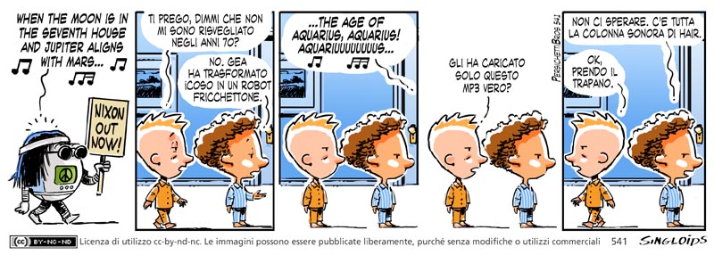 iCoso: When the moon is in the Seventh House and Jupiter aligns with Mars…. – Ted: Ti prego, dimmi che non mi sono risvegliato negli anni 70? – Bob: No. Gea ha trasformato icoso in un robot fricchettone. – …The age of Aquarius Aquarius! Aquariuuuuuuuus…. – Ted: Gli ha caricato solo questo mp3 vero? – bob: Non ci sperare. C’è tutta la colonna sonora di Hair. – Ted: Ok, prendo il trapano.