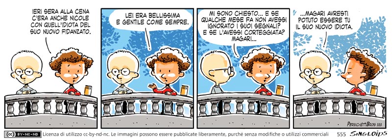Bob: Ieri sera alla cena c’era anche Nicole con quell’idiota del suo nuovo fidanzato. – Bob: Lei era bellissima e gentile come sempre. – Bob: Mi sono chiesto… e se qualche mese fa non avessi ignorato i suoi segnali? E se l’avessi corteggiata? Magari… – Sid: …magari avresti potuto essere tu il suo nuovo idiota.