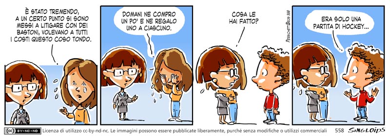 Izzie: E’ stato tremendo, ad un certo punto si sono messi a litigare con dei bastoni, volevano a tutti i costi questo coso tondo. – Izzie: Domani ne compro un po’ e ne regalo uno a ciascuno. – Meg: Cosa le hai fatto? – Bob: Era solo una partita di hockey…
