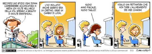 Bob sul tetto legge: Secondo uno studio ogni donna cambierebbe acconciatura in media 104 volte nell’arco della vita. Spesso a seguito di svolte esistenziali. – Pam: L’ho mollato! Anche questo era un cretino. Urge un cambio di look. – Meg: Nuovo anno fiscale, nuovo taglio! – Gea: Voglio una pettinatura che non turbi l’allineamento dei miei chakra!