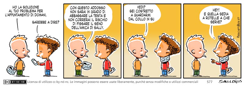 Ted: Ho la soluzione al tuo problema per l’appuntamento di domani. – Bob: Sarebbe a dire? – Ted: Con questo addosso non sarai in grado di abbassare la testa e non correrai il rischio di fissare il seno dell’amica di Sally. – Ted: Vedi? Sei costretto a guardare sopra mie spalle – Bob: Hey! E quella sedia a rotelle a che serve?