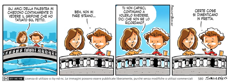 Izzie: Gli amici della palestra mi chiedono in continuazione di vedere il grifone che ho tatuato sul petto. – Bob: Beh, non mi pare strano… – Izzie: Tu non capisci, continuano a volerlo rivedere. Dici che non se lo ricordano? – Bob: Certe cose si dimenticano in fretta.