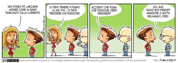 Pam: Non posso più lasciarmi andare come un ramo trascinato dalla corrente, devo prendere le sorti della mia vita in mano. Anche io devo prendere una posizione! – Bob: Accidenti che foga, che posizione credete prenderà? – Sid: Col suo nuovo boy-friend? Amazzone o gatto selvaggio secondo me.