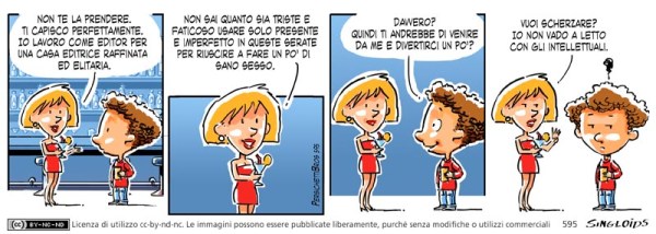 Tipa: Non te la prendere. Ti capisco perfettamente. Io lavoro come editor per una casa editrice sofisticata ed elitaria. – Tipa: Non sai quanto sia triste e faticoso usare solo presente e imperfetto in queste serate per riuscire a fare un po’ di sano sesso. – Bob: Davvero? Quindi ti andrebbe di venire da me e divertirci un po’? – Tipa: Vuoi scherzare? Io non vado a letto con gli intellettuali.