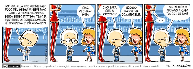 Sid: Non so. Alla fine questi fast food del sesso mi sembrano un po’ squallidi: senza seduzione, senza senso d’attesa. Temo di preferire un corteggiamento più tradizionale, più romantico. – Tipa: Ciao, mi chiamo Sara. – Sid: Ciao Sara, che mi racconti? – Tipa: Indosso biancheria commestibile. – Sid: Sei in auto o andiamo a casa tua con un taxi?