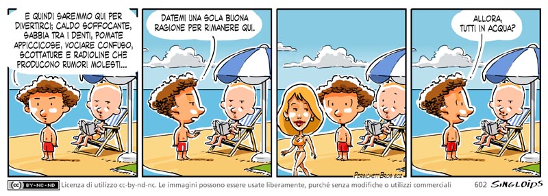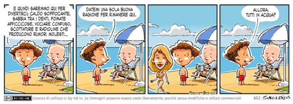Bob: E quindi saremmo qui per divertirci; caldo soffocante, sabbia tra i denti, pomate appiccicose, vociare confuso, scottature e radioline che producono rumori molesti… Datemi UNA sola buona ragione per rimanere qui. – Bob: Allora, tutti in acqua?