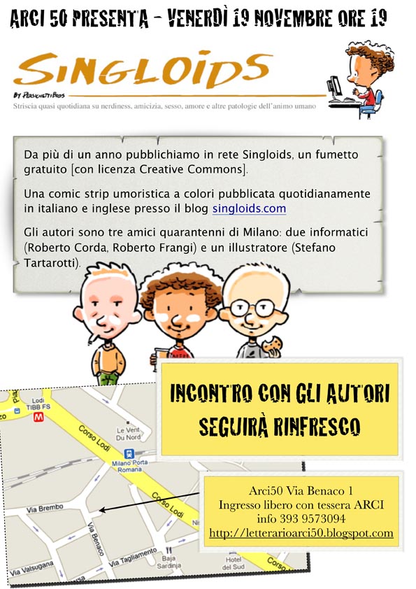 Il circolo Arci50 di Milano ci ha gentilmente invitato a partecipare a uno dei loro aperitivi letterari del venerdì per scambiare due chiacchiere su Singloids, bere qualcosa e presentare la nostra raccolta di strisce.