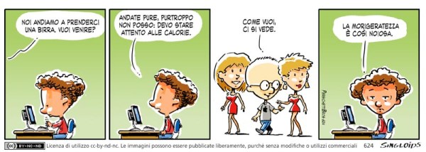Sid: Noi andiamo a prenderci una birra. Vuoi venire? – Bob. Andate pure, purtroppo non posso: devo stare attento alle calorie. – Sid: Come vuoi, ci si vede. – Bob: La morigeratezza è così noiosa.