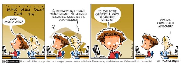 Bob: Sono ancora loro? – Collega: Sì, questa volta il tema è “meno Internet più Cabernet, guerriglia marketing e il dopo sbronza” – Bob: Dici che potrei chiedere al capo di cambiare reparto? – Collega: Dipende. Come stai in minigonna?