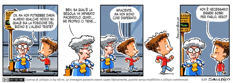 Bob: Ok, ma non potrebbe darmi almeno qualche indizio su quale sia la posizione del budino e l’alieno triste? – Anziana: Beh, sa qual’è la regola: va imparato facendolo. Quindi…. se proprio ci tiene…. Bob: Spiacente, ma non sono così disperato. – Bob: Non è necessario esseri sobri per farlo, vero?