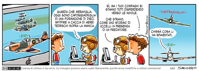 Sid: Guarda che meraviglia. oggi sono caposquadriglia di una formazione di 10 Spitfire sopra la manica a caccia di aerei tedeschi. – Bob: Guarda. I tuoi compagni si stanno tutti disperdendo verso le nuvole. – Sid: Sì che strano. Come uno stormo di uccelli in presenza di un predatore. – Sid: Chissà cosa li ha spaventati?